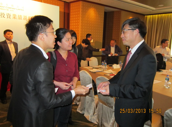 2013年3月25日,濱海投資在香港怡東酒店海景廳,成功舉行了專門針對(duì)機(jī)構(gòu)投資人的業(yè)績說明會(huì),公司執(zhí)行董事總經(jīng)理高亮、副總經(jīng)理兼財(cái)務(wù)總監(jiān)張忠海、總經(jīng)理助理鄭宇嬰與到會(huì)的投資者們圍繞公司本次業(yè)績、經(jīng)營管理、競爭優(yōu)勢(shì)、發(fā)展戰(zhàn)略等方面進(jìn)行了廣泛深入的交流。